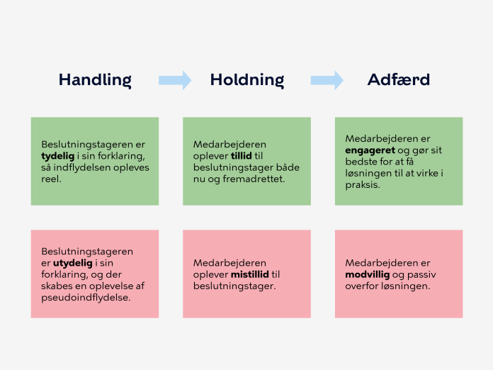 Uanset om beslutningen træffes af lederen, trioen eller en arbejdsgruppe, har forklaringen stor betydning for, hvordan indflydelsen opleves. Den måde beslutninger forklares på, påvirker medarbejdernes oplevelse af indflydelse – og dermed deres engagement i at få løsningen til at lykkes.